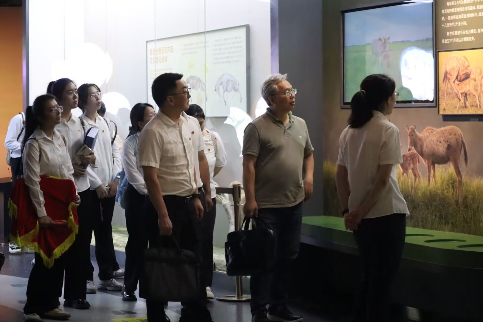 参观麋鹿博物馆,观看《重回长江的麋鹿》纪录片,大家了解了麋鹿的濒危历史与保护区的发展历程,深切感受“全球濒危物种保护的成功范例”,感叹生态文明建设取得的伟大成绩。