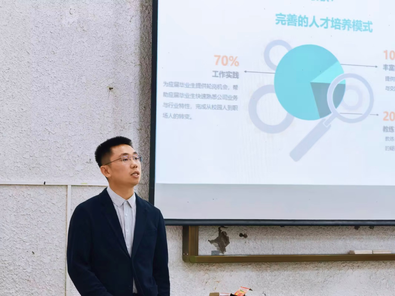 随后,韦如智先生围绕企业人才培养与发展体系展开介绍,详细讲解了公司“70%工作实践+10%培训课程+20%一对一带教”的完善培养模式,以及系统的入职培训、岗位培训与专属带教机制。他还展示了技术、研发、管理三大序列构成的清晰职业发展路径,并同步介绍了企业具备竞争力的薪酬、全面的福利保障与丰富的团建活动,为同学们勾勒了全方位的职场成长支持图景。