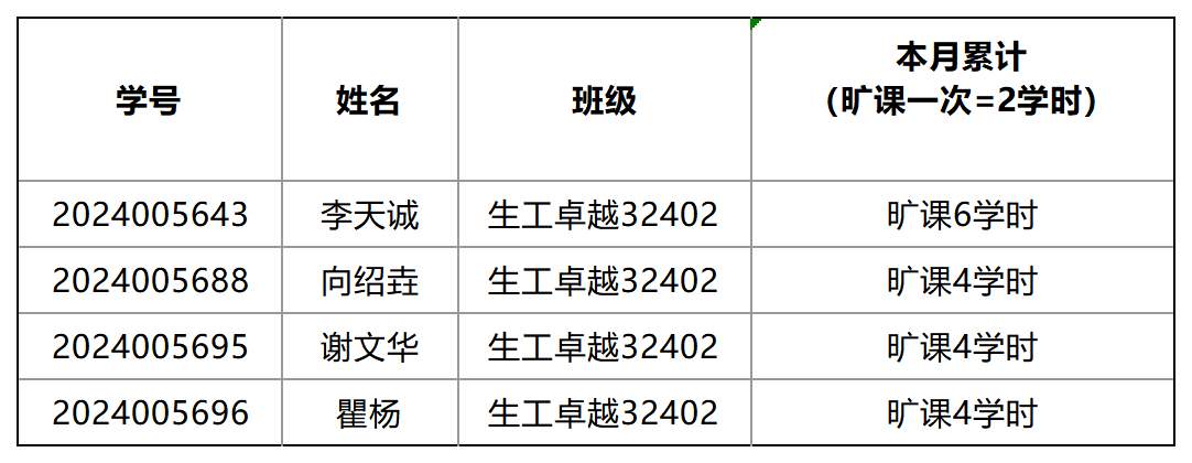 根据课堂考勤结果,累计旷课2学时(旷课1次=2学时)的,14名同学;累计旷课4学时及以上的,1名同学。为严肃校风校纪,督促学生按时到课,及时教育违纪学生,根据《长江大学学生违纪处分办法》第十五条、《球王会平台课堂考勤实施办法》,经学工办研究决定,对本月累计旷课4学时及以上的同学予以通报批评: